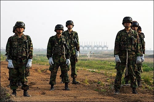 | ▲ 철조망 설치작업에 들어가기 전에 경비를 서고 있는 군인들. ⓒ프레시안 |