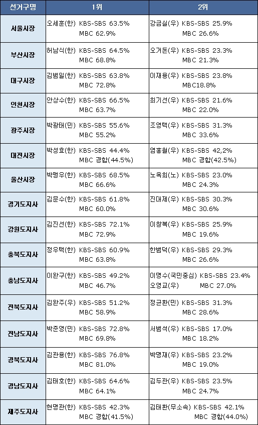 KBS-SBS 예측 조사 결과 각 지역에서 당선이 유력시 되는 한나라당 광역단체장 후보는 서울 오세훈, 부산 허남식, 대구 김범일, 인천 안상수, 울산 박맹우, 경기 김문수, 강원 김진선, 충북 정우택, 충남 이완구, 경북 김관용, 경남 김태호 등 11명이다.