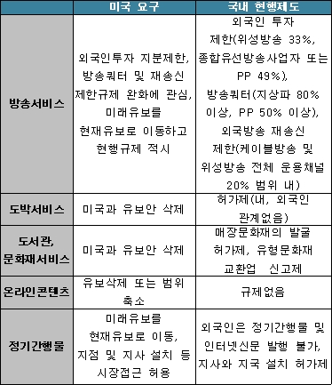 미국은 한국 측이 미래유보 분야로 분류한 도박과 도서관, 문화재 산업에 대해 유보대상에서 제외할 것을 요구했고, 온라인콘텐츠에 대해서는 유보대상에서 제외하거나 유보의 범위를 축소할 것을, 정기간행물에 대해서는 한국 측의 미래유보 안을 현재유보로 변경하고 지점 및 지사 설치 등의 시장접근을 허용해줄 것을 각각 요구했다.