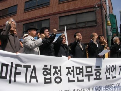 한미 자유무역협정(FTA) 협상이 2일 오후 1시께 타결된 것으로 알려지자 한미 FTA 저지 범국민운동본부(범국본)는 "퍼주기에 퍼주기를 거듭하다 속옷까지 다 벗어주고 마침내 협상을 타결지었다"면서 '원천 무효'를 주장했다.