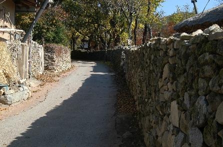 외암리의 명물 가운데 하나인 고풍스런 돌담이 오밀조밀한 골목길 사이로 미로처럼 이어지는데 총 길이가 무려 5km에 이릅니다. 한 번은 이 마을을 처음 찾아온 엿장수가 마을 밖으로 나가는 길을 찾지 못해 반나절 내내 같은 길만 '뱅뱅' 돌았다고 할 정도였죠. 하지만 이 돌담들은 결코 위압적이지 않아서 이 마을을 찾는 사람들로 하여금 소박하고 편안한 고향의 정취를 느끼게 해줍니다."
