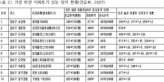 결국 건교부가 발표한 가장 비싼 아파트 10채 순위는 정확히 말하면 가장 비싼 아파트가 있는 단지 10곳이고, 해당 단지에서 한 채씩 가장 비싼 아파트 열 채를 추린 것이다. 따라서 대한민국에서 가장 비싼 아파트를 소유한 아파트 부자 100명은 더 갈 것도 없이 아이파크, 상지리츠빌카일움2차, 타워팰리스1차 안에 다 살고 있는 것이다.