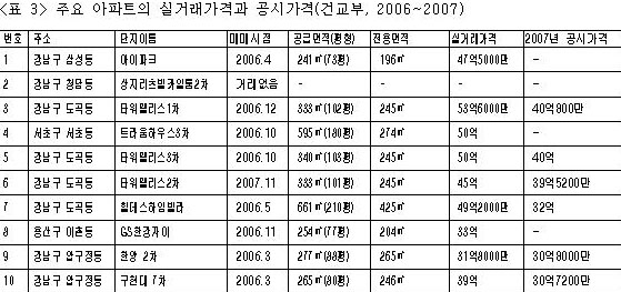 타워팰리스1차 333㎡의 경우 건교부는 2007년 공시가격을 40억800만 원으로 발표했지만, 건교부 아파트 실거래가 조회 결과 2006년12월에 53억6000만 원에 팔고 산 것으로 나타났다. 공시가격 40억의 타워팰리스3차 340㎡는 50억에, 공시가격 39억5200만 원의 타워팰리스2차 333㎡는 45억에, 공시가격 32억의 힐데스하임빌라 661㎡은 49억2000만 원에 매매되었다.