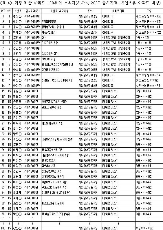 그러나 건교부 발표 공시가격으로 한다면 타워팰리스1차에서 똑같은 공시가격 40억800만원짜리 아파트에 사는 102명이 공동으로 15위를 차지하고 있어서 누구까지를 끊어서 아파트 100대 부자로 추려야 할지 난감한 상황을 만나게 된다.