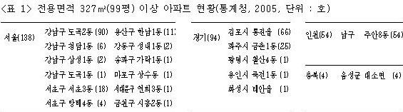 한 가지 더 뚜렷이 할 게 있다. 타워팰리스1차에는 건교부가 발표한 333㎡(102평) 보다 훨씬 넓은 409㎡(124평)형이 60가구나 존재한다. 그렇다면 건교부의 비싼 아파트 목록에 409㎡(124평) 대신 333㎡(102평)이 올라간 이유는 뭘까.