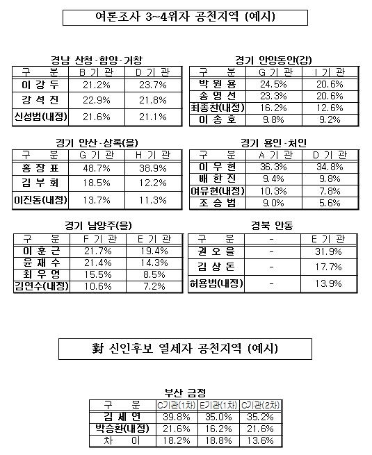 김 의원은 또 ▲경기 안산.상록을 ▲경기 용인.수지 ▲경기 용인.처인 ▲경기 이천.여주 ▲경기 포천.연천 ▲경기 남양주을 ▲경기 안양동안갑 ▲부산 서구 ▲부산 남구 ▲부산 사상 ▲대구 달서을 ▲경북 안동 ▲경남 산청.함양.거창 등의 여론조사 결과를 제시하며 "지지율이 3배 이상 낮은데도 공천을 받고, 심지어 지지율 3~4위인 후보가 공천을 받는 것은 납득할 수 없다"고 주장했다.(표 참조)