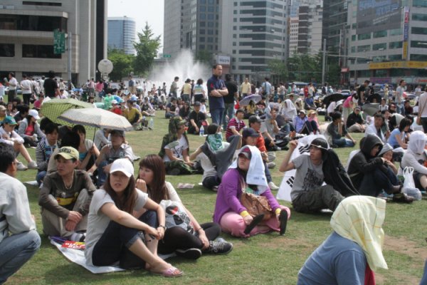 새벽 진압 현장을 인터넷 생중계를 통해 지켜봤다는 이석(가명) 씨는 한숨도 자지 않고 이 곳 서울광장으로 나왔다. 그는 "여태까지 촛불 집회에 안 나왔다는 게 아주 부끄러웠다"며 "테러범을 잡아야 할 경찰특공대가 평화 시위를 하는 시민을 때려잡다니 가만히 앉아있을 수가 없었다"고 말했다. 그는 "현재 지방에서 올라오는 관광버스를 톨게이트에서 경찰들이 회차시키고 있다고 들었다"며 "전두환 때보다도 지금이 더 심하다"고 말했다.