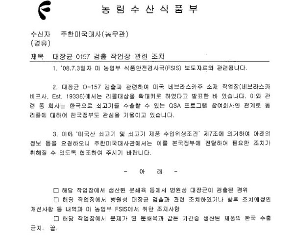 농림부 장관이 지난 16일, 주한 미국 대사관에 보낸 공문이다. 장관은 주한 미국 대사에게 한국형 QSA(품질체계평가) 작업장으로 미국 정부로부터 승인을 받은 네브라스카 비프 회사의 분쇄육에서 O157 대장균이 검출된 경위 등에 대한 정보를 요청했다. 그리고 이 작업장에서 식품 회수 조치(리콜)된 분쇄육과 같은 기간에 생산된 분쇄육의 한국 수출을 금지하도록 요청하였다. 그러나 아직 미국으로부터 답신은 오지 않았다.