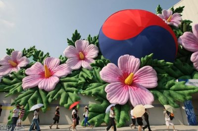 | ▲ 정부는 15일 제63주년 광복절 및 대한민국 건국 60년 중앙 경축식 행사를 위해 광화문 외벽에 대형 무궁화를 설치했다. ⓒ연합뉴스 |