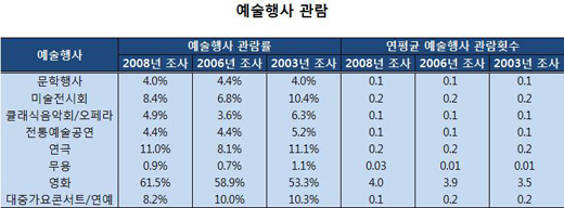 | ▲문화체육관광부가 발표한 올해 한국인의 문화소비성향. 대중가요콘서트와 연예산업에 대한 소비성향은 연극이나 미술전시회보다 낮았다. '대중'문화라 일컫기 민망한 수준이다. ⓒ프레시안 |