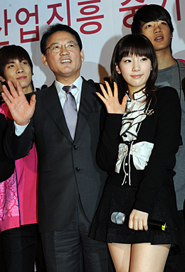 | ▲유인촌 문화체육관광부장관이 지난 4일 서울 강남구 신사동 에브리싱 노래연습장에서 '음악산업진흥 중기계획'을 발표하고 난 뒤 기념촬영을 하고있다. 이곳은 특정 기획사가 소유한 곳이라 발표후 논란이 됐다. ⓒ뉴시스 |