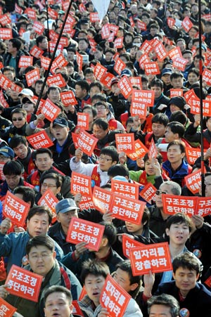 | ▲ 민주노총이 주최한 '용산 참사 살인 정권 규탄! MB 악법 저지! 경제 파탄 책임전가, 이명박 정권 심판 전국 노동자 대회'가 28일 여의도 문화마당에서 열렸다. 이날 대회에는 이례적으로 3만여 명의 노동자들이 참석해 이명박 정권 규탄 목소리를 높였다. ⓒ 뉴시스 |