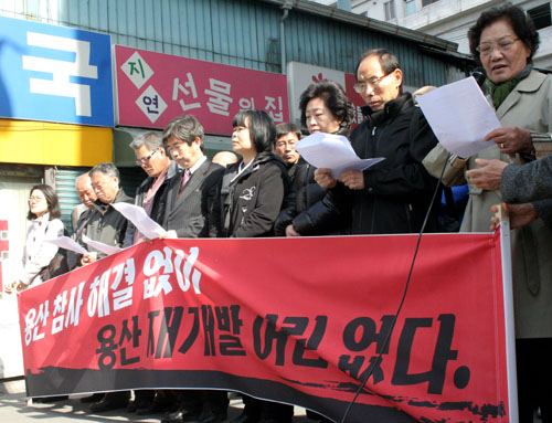 이들은 "용산 참사 해결 없이 재개발은 불가하다"며 "모든 수단을 동원해 용산에서 벌어지는 살인 재개발을 막아 낼 것이다"고 밝혔다.