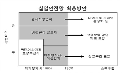 영세자영업자를 위해서는 "경영안정 지원, 긴급 생계대책, 재기 노력 지원으로 대책을 구분해 시행해야 한다"고 제안했고, 청년·장기 실업자를 위해서는 "생계비 보조 차원의 실업부조 도입"을 주장했다. 가계 소득이 최저생계비의 130% 미만인 실업자 23만9000명에게 최저임금의 50%를 6개월 간, 1인당 총 250만8000원을 지원하면 연간 6005억 원의 예산이 필요하다는 계산이다.