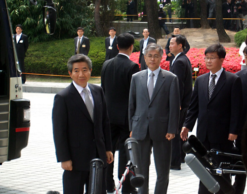 | ▲ 4월 30일 대검찰청 앞에 도착한 노무현 전 대통령. 왜 대한민국 검찰은 '못하는 짓'이 없는 것일까? 이성도, 윤리도, 상식도, 원칙도 왜 검찰의 '광란'을 억제해 주지 못하는 것일까? 군사독재 시절에 만들어진 권력의 파편 하나가 21세기 깊숙이까지 살아남아 한국 사회의 내출혈을 끊임없이 일으키고 있는 것일까? 제거 수술의 필요성이 시급하다. ⓒ프레시안 |