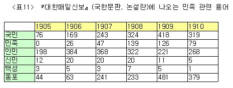 한편 1904년부터 1910년까지 간행된 『대한매일신보』의 경우는 확연하게 다르다. <표11>이 보여주듯이, "백성"의 사용은 현저하게 쇠퇴하고 "인민"의 용례는 어느 정도 남아있지만 대신 "국민"이 점차 가장 자주 쓰이게 된 것을 보여준다. 동시에 "민족"도 이 시기에 서서히 주요 용어로 자리를 잡은 것이 보인다. 물론 "민족"이 가리킨 의미도 다양하다. 한 집안의 구성원, 사농공상 각 계급, "호남 민족" 등 지방의 주민, 등을 가리키는 경우도 있고, "숙신 민족", "예맥 민족", "거란 민족"처럼 사용되기도 했으며, "튜톤 민족", "지나 민족", "일본 민족"을 일컫기도 했다. 그래서 권보드래는 이 시기 민족이라는 단어가 사용된 의미를 ① 막연히 사람들을 가리키는 의미, ② 부족, ③ 일정한 국가에 소속하는 구성원, ④ 국가가 없는 상태에서도 존재할 수 있는 국가의 원형적 집단 등, 넷으로 정리했다. 한국어에서 "민족"은 1897년에 쓰이기 시작해서 1910년까지 ①의 의미에서 ④의 의미로 변천했다는 것이다.