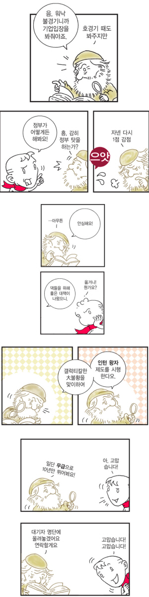 오늘날 빈부 차는 더 커지고 일자리는 더 위태위태하며 FTA는 몰려오고 민영화는 몰아친다. 그러나 그 의미는 숫자에 가려져 있다. GDP 몇%, 교역량 및 몇 위라는 알쏭달쏭한 암호의 그늘에 감춰진 이야기, 즉 철수는 재개발로 부자가 되지만 영희는 삶의 터전을 잃어버리고 쫓겨나리라는 이야기를 굳이 들추어내는 건 의미 있는 일이 되리라. 지금 시점에 이 만화를 모아 책을 묶자던 편집자님의 말씀은 옳았다." (머리말)