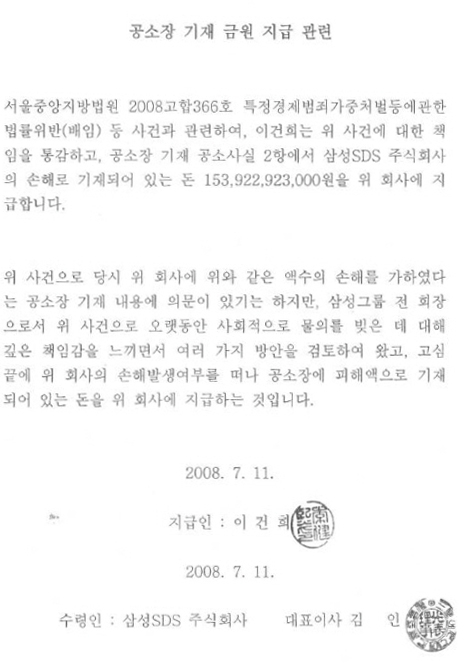 이 앙형참고자료의 논리구조를 다시 정리하면, '헐값발행은 인정한다. → 그러나 헐값발행은 회사의 손해가 아니므로, 형사적으로는 무죄다. → 다만, 헐값발행에 따른 기존주주의 민사적 손해는 도의적 책임상 변제한다. → 그러니, 선처해 달라.'는 것이다. 그리고 이건희 전 회장과 두 회사 대표이사의 도장이 '빡' 찍혀 있다.