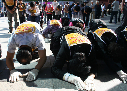 | ▲ 경찰에 가로막힌 삼보일배. 전재숙 씨(맨 왼쪽)가 눈을 감은 채 앉아 있다. ⓒ프레시안 |