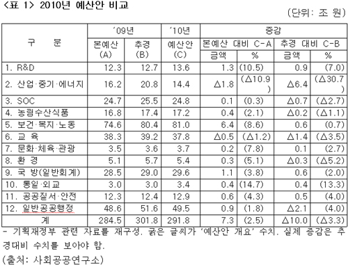 2010년도 이명박 정부의 예산안은 이 정부가 나랏돈을 어디에 얼마나, 어떻게 쓸 것인지 그 정책 방향과 의도를 읽을 수 있으며, 국회의 예산 심의는 바로 이를 놓고 어디에 얼마를 더 보태고 더 뺄 것인가를 결정하는 것입니다. 이 결정이 이뤄지면, 이를 쫓아 정부가 돈을 쓰는 것입니다. 국회 심의는 내년도에 쓸 돈을 결정하는 최종 관문이라고 할 것입니다.