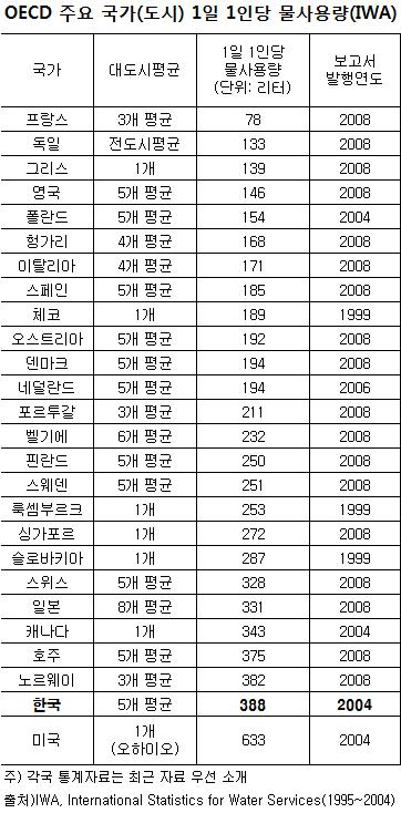 세계물협회(IWA)의 통계 자료에 따르면 OECD 국가 26개국 중에서 우리나라의 1일 1인당 물사용량은 미국을 제외하고 가장 높다. 미국의 오하이오주 통계가 미국 전체 주를 대표하는 통계가 아니라는 점을 고려할 때 우리나라의 1일 1인당 물사용량은 OECD 국가 중에서 가장 높다고 볼 수 있다.