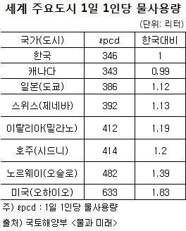 "우리나라 1일 1인당 물사용량을 다른 선진국들과 비교하면 캐나다보다는 많은 편이나, 미국,일본,스위스,이탈리아 등에 비해 적게 나타났다."