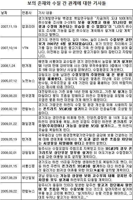 필자는 이들 보고서들에 흥미를 갖고 '보의 존재와 수질 간의 관계'에 대한 언론사 기사들을 추적해 보았다. 그 결과 '보의 축조는 수질을 악화시키는 반면, 보의 철거는 수질개선에 기여한다'는 많은 수의 보도내용을 확인할 수 있었다. 반면 국토부의 주장을 뒷받침하는 기사는 그 어디에서도 찾아볼 수 없었다.