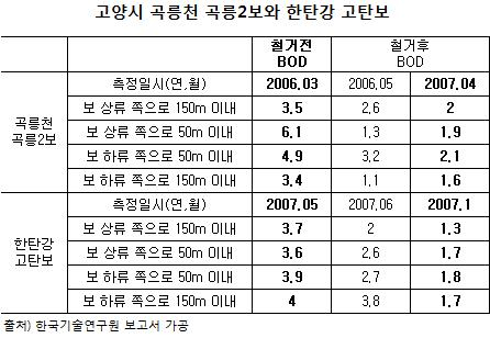 이 보고서에 따르면 고양시 곡릉천 곡릉2보의 경우 보 철거 전 3.4~6.1ppm이었던 BOD(생화학적 산소 요구량)는 철거한지 1년 후 1.6~2.1ppm으로 크게 개선되었다. 한탄강 고탄보의 경우도 보 철거 전 3.6~4.0ppm이었던 BOD(생화학적 산소 요구량)가 철거한지 5개월 후 1.3~1.8ppm으로 개선된 것으로 나타났다.