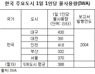 IWA(2004)에 따르면 우리나라 1일 1인당 물사용량은 서울 370리터, 대구 430리터, 인천 418리터 등으로 5개 대도시 평균은 388리터인 것으로 나타난다. 이 수준은 선진국들 대도시들보다 훨씬 더 높은 것이다.