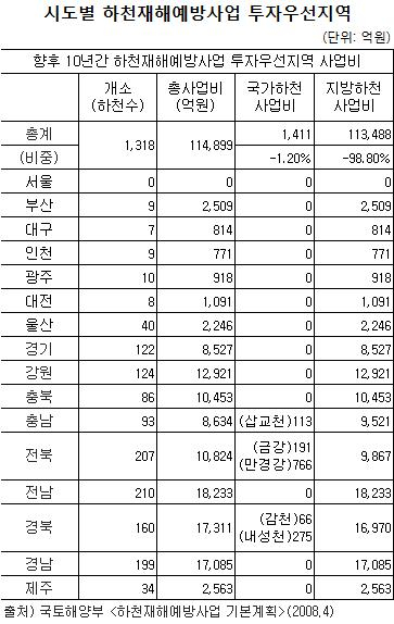 이 계획에 따르면 향후 10년간 하천재해예방사업 투자우선지역에 투자되는 사업비 중 국가하천에 투입되는 사업비 비중은 고작 1.2%에 불과하다. 하천재해예방사업이 국가하천이 아니라 지방하천에서 우선적으로 이루어져야 함을 명백하게 나타내 주는 자료다.