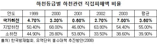 한국방재협회는 2008년 보고서에서 1999년과 2003년 전체 하천관련 직접피해액 중 국가하천에서 발생하는 피해는 고작 3.6%에 불과하다고 썼다. 또 이들은 "이런 조사 결과는 (그 동안) 지방하천에 대한 투자규모가 국가하천에 비하여 매우 열악했다는 것을 간접적으로 보여주는 지표"라고 덧붙혔다.