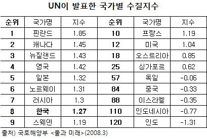 그리고 덧붙여 친절하게 UN이 2003년 발표한 '국가별 수질지수'라는 표를 첨부해 보여준다.