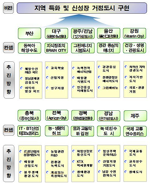 지난해 9월 6일 국토해양부가 발표한 혁신도시안에 따르면 대구의 팔공이노밸리는 솔라시티로 조성하고 경북 포항의 포스텍 연료 전지연구소, 포항산업과학연구원(RIST) 연료전지연구단을 활용한다는 계획이 마련돼 있다. 세종시가 내건 신재생에너지 사업과 바로 겹친다. 울산의 울산그린밸리도 첨단 에너지 연구 도시이며 경남 한가람도시 또한 그린에너지와 IT 연구를 표방하고 있다.