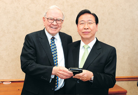 ▲ 워런 버핏과 정준양 회장의 기념 사진. 버핏은 정 회장의 기념 촬영 제안에 "재미있게 찍자"며 자신의 지갑을 꺼내 함께 맞잡고 환하게 웃으며 포즈를 취했다고 한다. ⓒ포스코 |